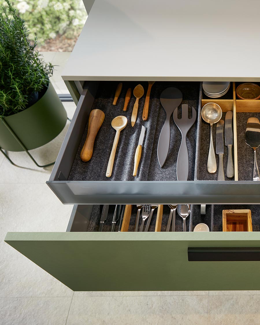 יש למותג מערכות ארגון פנימיות, הכוללות מגירות עם מחיצות מעץ מלא וחומרים איכותיים נוספים, המאפשרות ארגון יעיל של כלי המטבח.