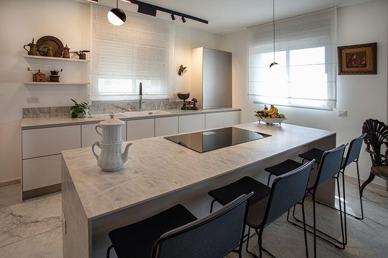 צילום: גידי בועז תהליך העיצוב של מטבח חדש כולל גם את התאמת משטחי העבודה. בדרך כלל בחירת משטחי העבודה מתרחשת בפועל במהלך השלבים האמצעיים עד