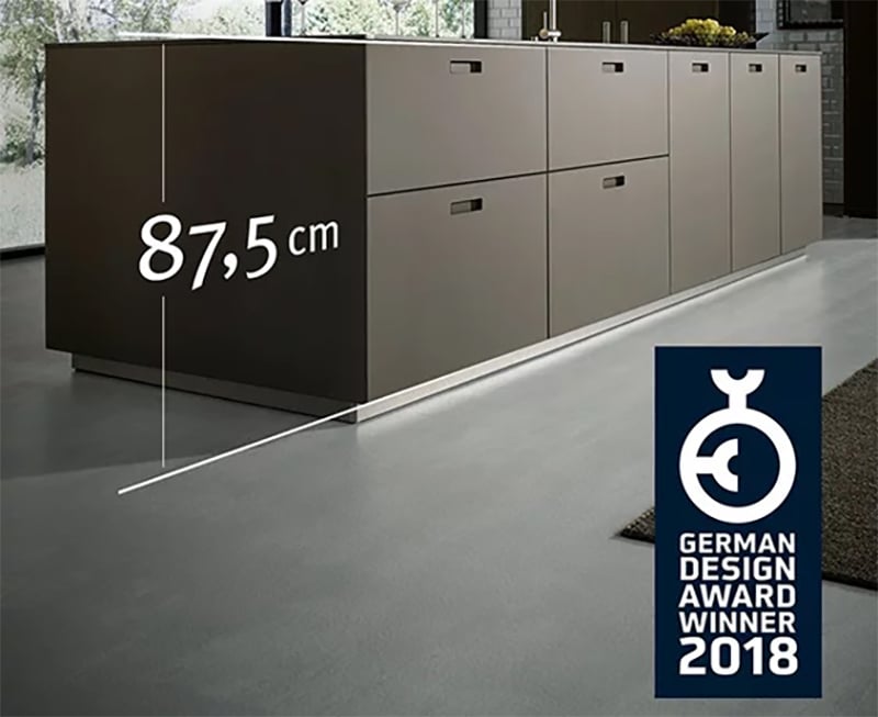 לארונות תכולה רבה, כ-25% יותר ממטבח ממוצע. המסד הדיסקרטי יוצר תחושה של מטבח צף והמרווח, ברוחב צל הארונות בלבד, מדגיש את המבנה הקובייתי המרחף של ארונות המותג.